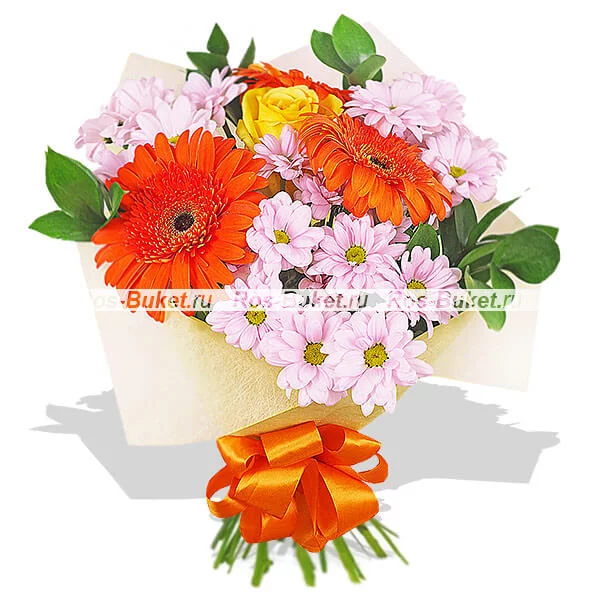 Стандартный (на фото): роза желтая (в центр) - 1 шт, гербера оранжевая - 3 шт, хризантема кустовая  светло-розовая - 3 шт, рускус, фетр желтый, бант оранжевый.